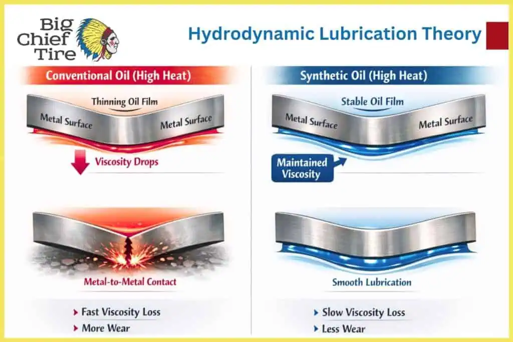 - Conventional Oil Chemistry: Mineral-based oils contain hydrocarbon chains of varying lengths. Under heat stress, these chains break irregularly, causing rapid viscosity loss. In sustained heat, conventional oil’s protective properties decline significantly after 3,000-4,000 miles. The degradation is both faster and less predictable than in moderate climates.